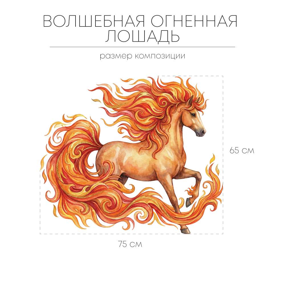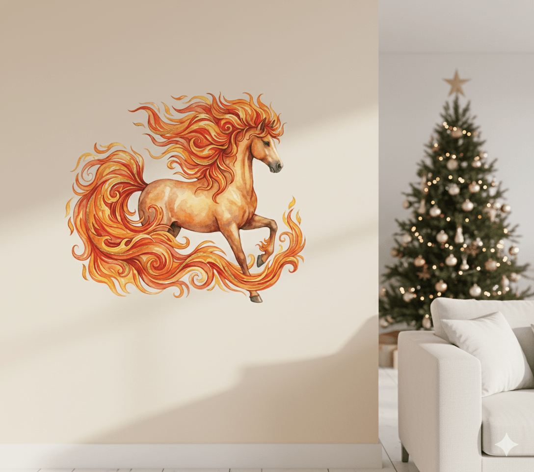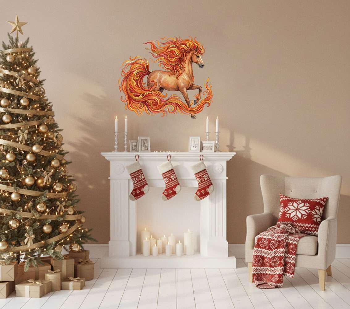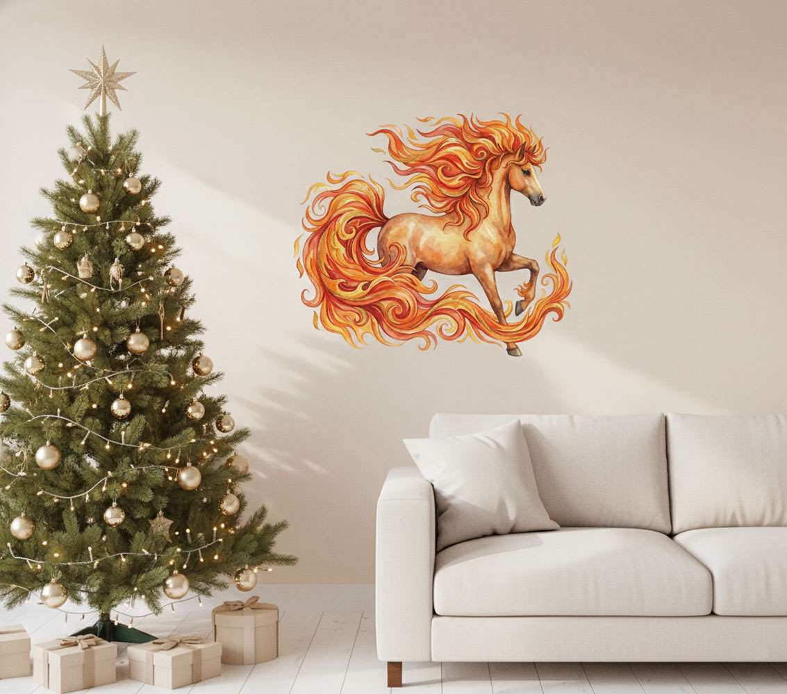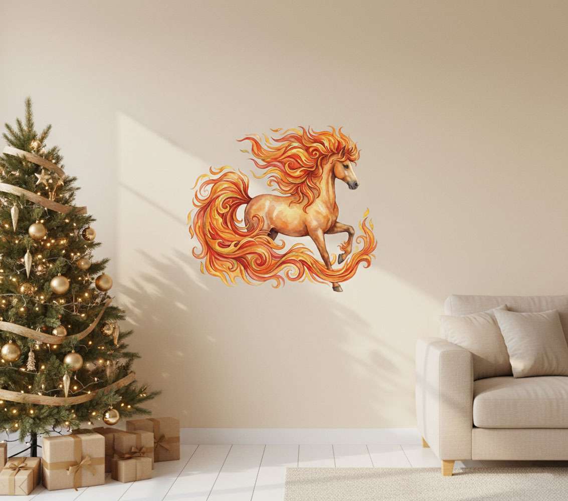Создайте атмосферу праздника и сказки в интерьере с новогодней наклейкой на стену «Волшебная огненная лошадь». Изящная лошадь с пылающей гривой и хвостом, выполненная в теплых огненных оттенках, символизирует силу, удачу, движение вперед и обновление — идеальный образ для Нового года.